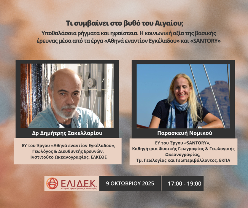 Ενημέρωση για την εκδήλωση του ΕΛ.ΙΔ.Ε.Κ. με τίτλο: Τι συμβαίνει στο βυθό του Αιγαίου; Υποθαλάσσια ρήγματα και ηφαίστεια. Η κοινωνική αξία της βασικής έρευνας μέσα από τα έργα «Αθηνά εναντίον Εγκέλαδου» και «SANTORY», η οποία θα πραγματοποιηθεί την Πέμπτη 9 Οκτωβρίου 2025 και ώρα 17:00 στην αίθουσα εκδηλώσεων του ΕΛ.ΙΔ.Ε.Κ. επί της Λεωφόρου Συγγρού 185 & Σάρδεων 2, Νέα Σμύρνη, Αθήνα: