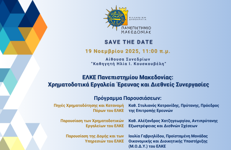 Save the date: Εκδήλωση ΕΛΚΕ Πανεπιστημίου Μακεδονίας: Χρηματοδοτικά Εργαλεία Έρευνας & Διεθνείς Συνεργασίες – 19/11